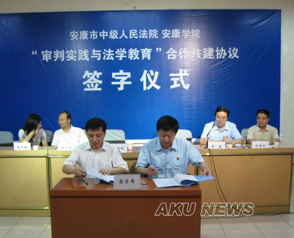 随后,安康学院党委副书记胡鸿晓教授与安康中院赵晓旭副院长,分别代表各自单位签署了审判实践与法学教育合作共建协议书,签约仪式结束后,两个单位领导共同为安康学院实习实训基地揭牌。